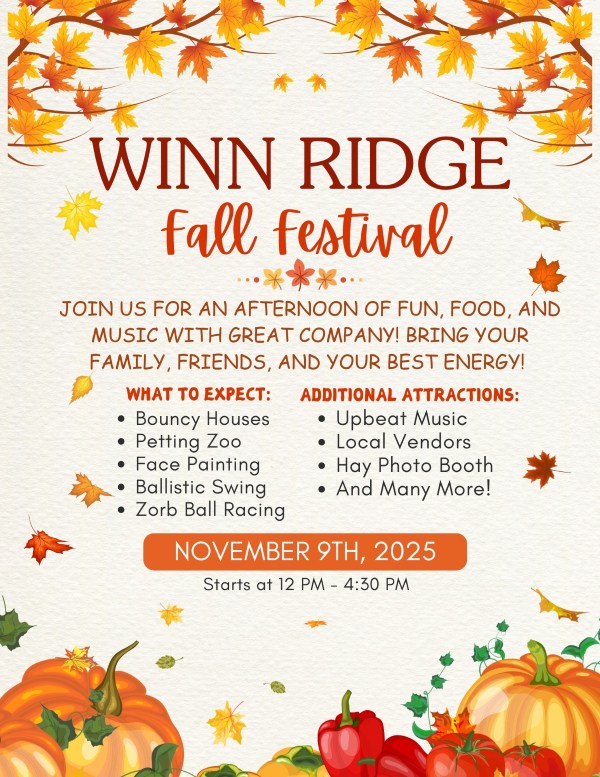 Join us for the Winn Ridge Fall Festival on Sunday, November 9 from 12:00 PM to 4:30 PM at 2601 Walker Avenue, Aubrey, TX 76227.