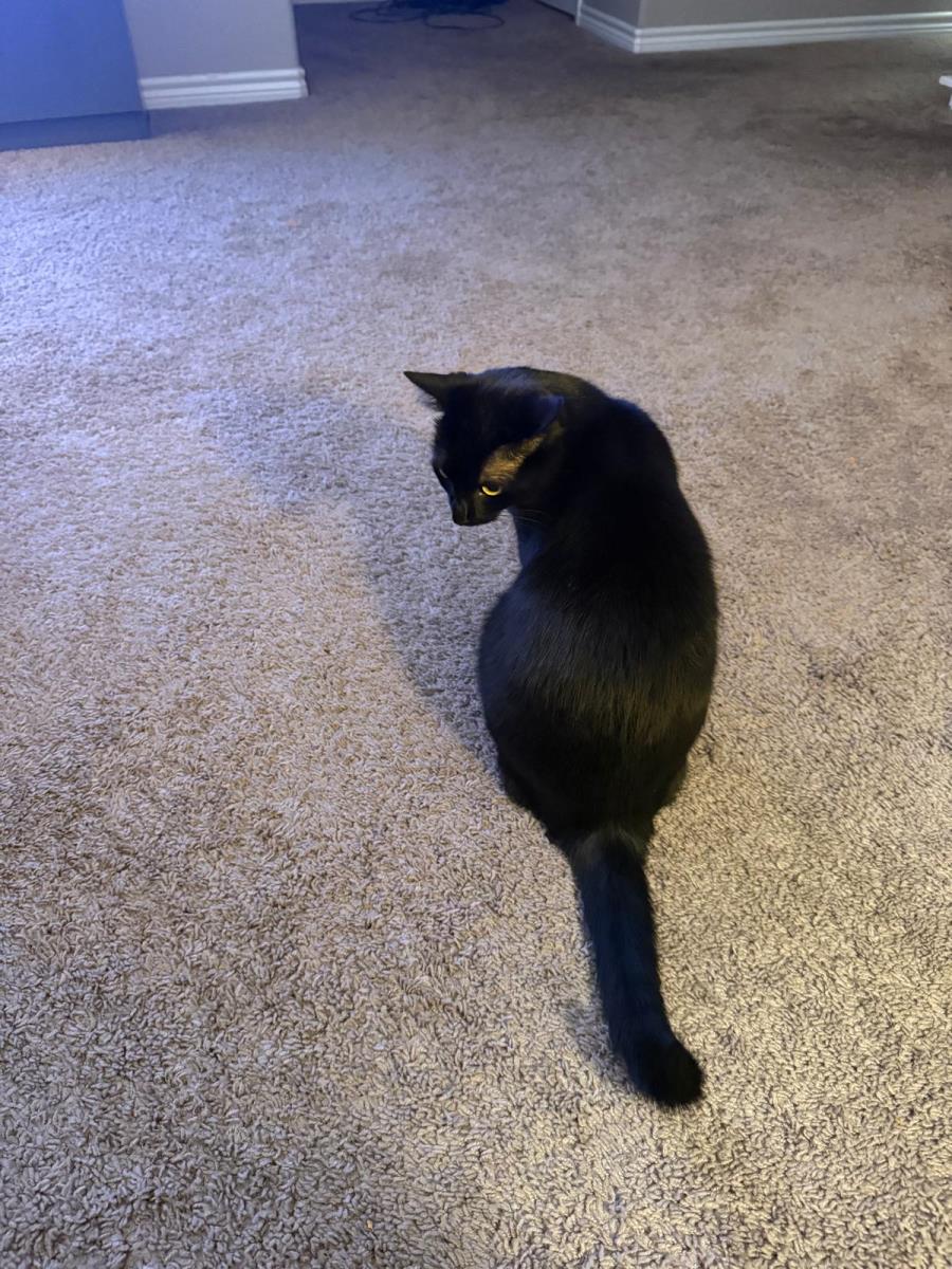 “She is a slender, sleek black cat with shiny fur, small in size, panther-like, very smooth short coat, and may be hiding because she is shy.” cell# 630 802 3838
